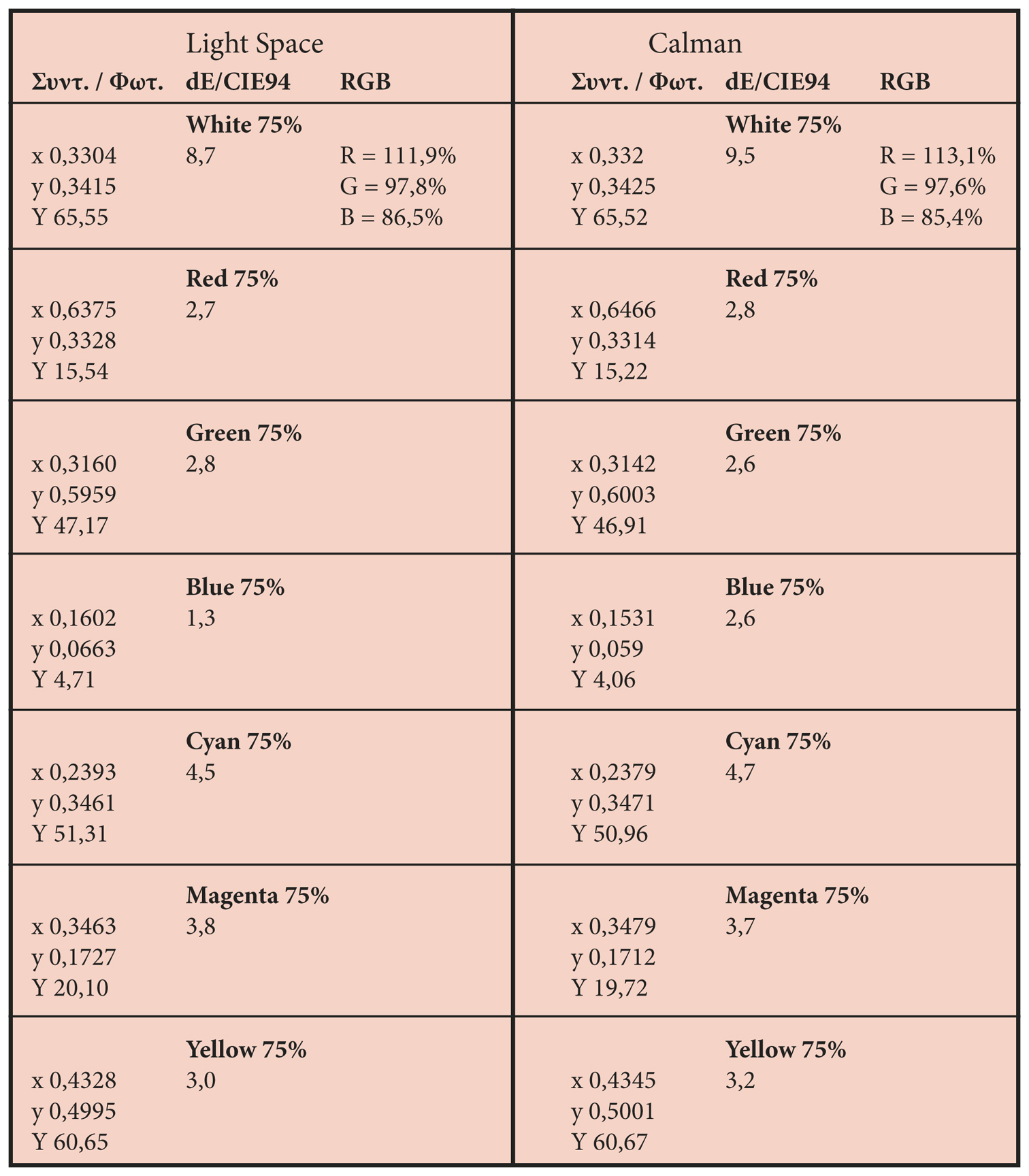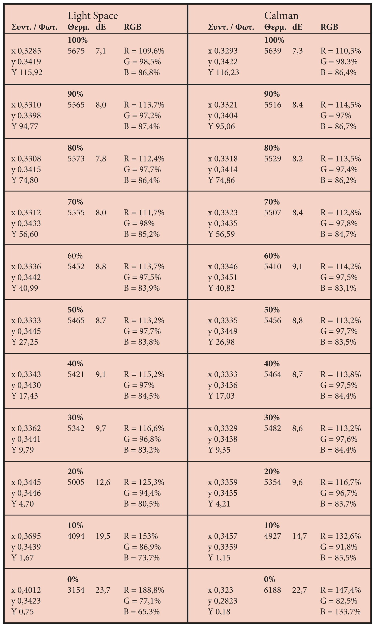 The two analytical tables below we attach benchmarking data from both programs. I’ve put the coordinates (x, y) of each measurement, and the returned to brightness in nits every paternaki. Also indicate the color temperature and the dE v of DE2000 RGB and CIE94 colour during measurements. About color temperature, which is generally non-comparable, one and the same color temperature can be achieved with many different combinations of RGB, in the specific case is comparable, because both programs count in the same direction, i.e. towards the very warm, as illustrated by the RGB percentages in the tables.