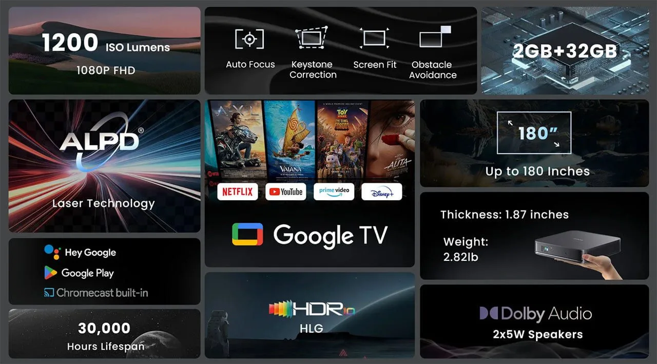 The official Google TV with all official (licensed) streaming platforms works like a charm, it’s a powerful feature that you don’t usually encounter often on any brand, even on more expensive laser projectors.