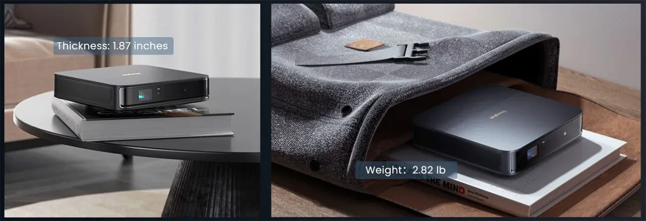 With dimensions of 7.68 x 7.68 x 1.87 inches (20 x 20 x 4.7 cm) and a weight of only 2.82 lb (1.3 Kg), we are dealing with a projector that’s almost easier to carry around than a tablet or a book.