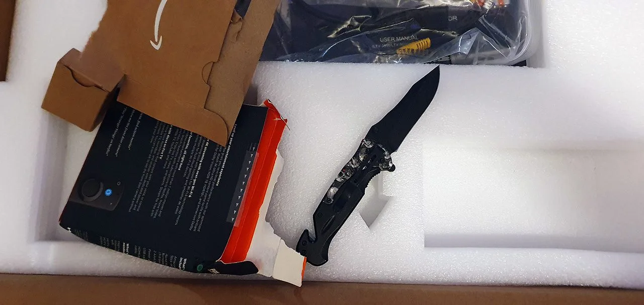 Clearly, AWOL couldn’t have anticipated that an employee from UPS (I assume) would desire a free Amazon Fire Stick 4K so badly, could they? When I opened the box, I was stunned to find this. What on earth is a knife doing inside my new projector box?