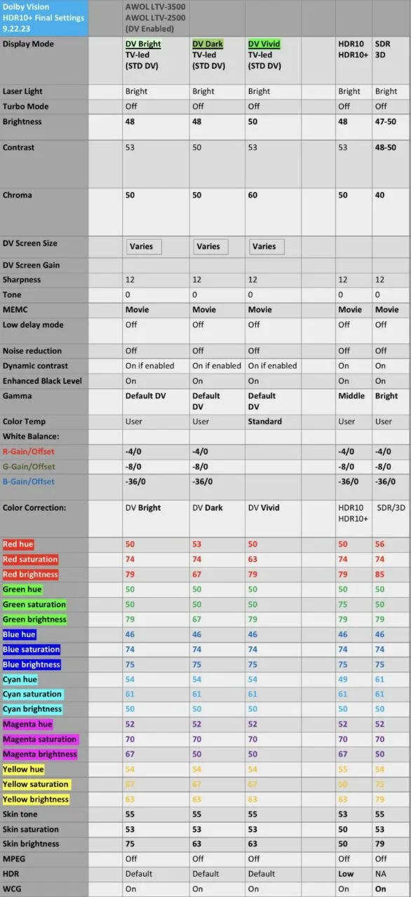 Great review! I have a 3500, which further helps w/3D & needed brightness. In addition to “lower the blue gain by 30+ units”, can you please shared full settings you dialed in. Especially as you mention you “do not totally agree with” the above settings from AWOL? They’re actually from @Dgtr74 on AVSForum, and he has revised/updated multiple times since. Latest at https://www.avsforum.com/threads/awol-ltv-2500-ltv-3500-picture-settings.3271691/post-62449423