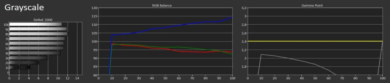 The blue color is significantly more prominent compared to the other two primary colors (red and green). This blue tint also affects the gamma value, pushing it below the ideal 2.2-2.4 range, and drives the DeltaE error chart to a +10 error value, which is undesirable. This issue must be corrected immediately by the user through the white balance submenu.