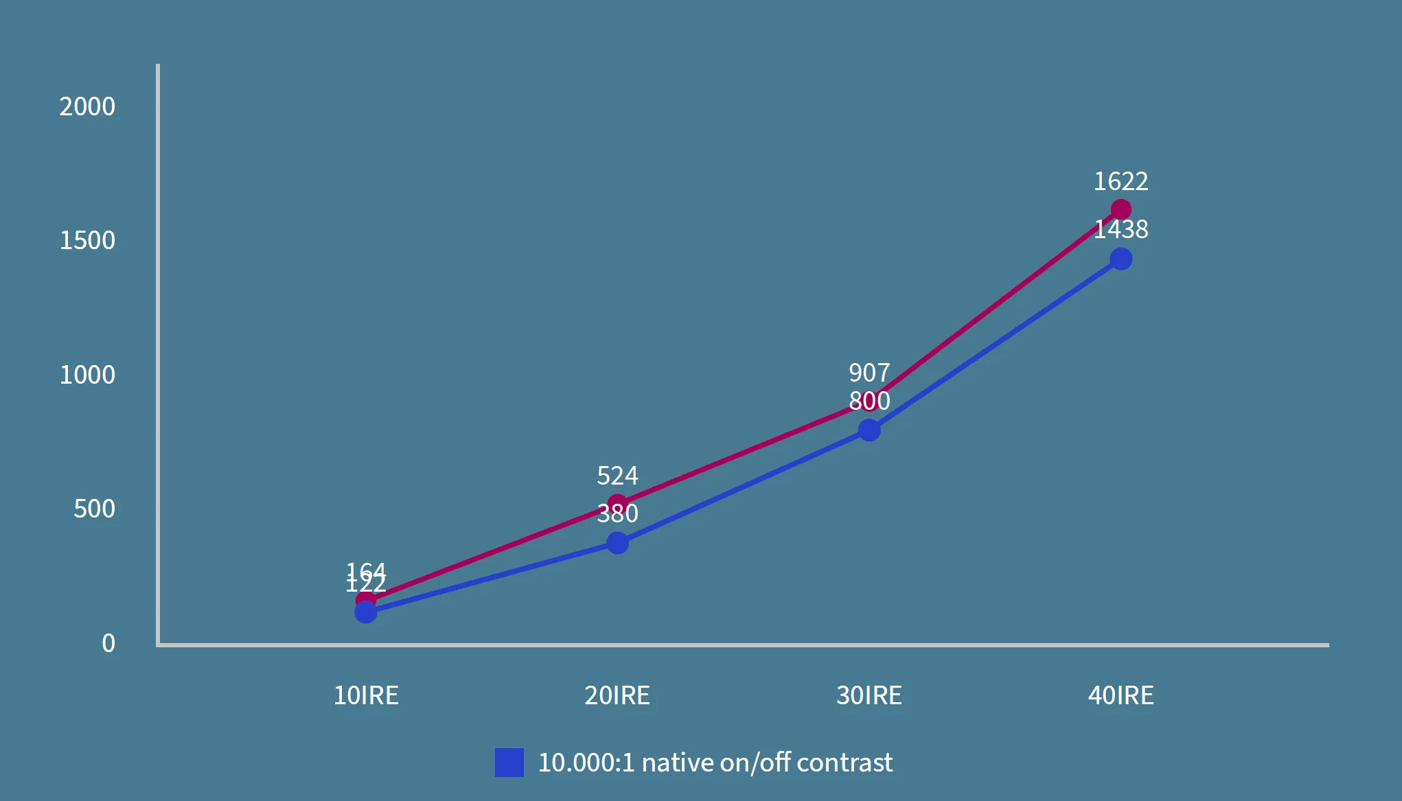 With a 5,000:1 projector, the black level would be 0.31 fl (1550 ÷ 5000). Comparing this to the Valerion, we find that with EBL on, Valerion rivals the 5,000:1 projector and even surpasses it in dark scenes containing up to 50 IRE brightness, with better contrast performance and deeper black levels. Here’s the contrast chart up to 60IRE (Valerion on red).