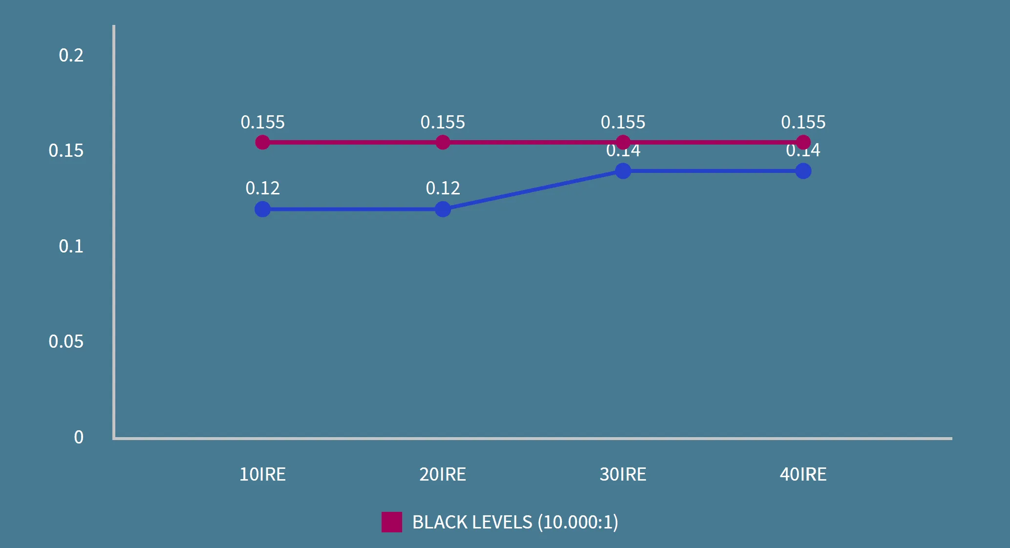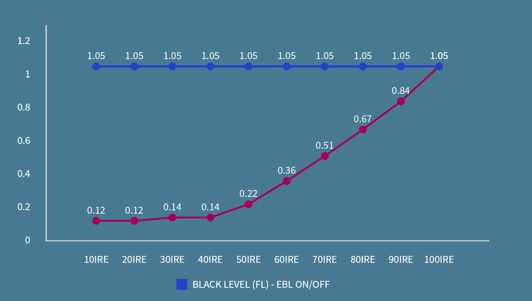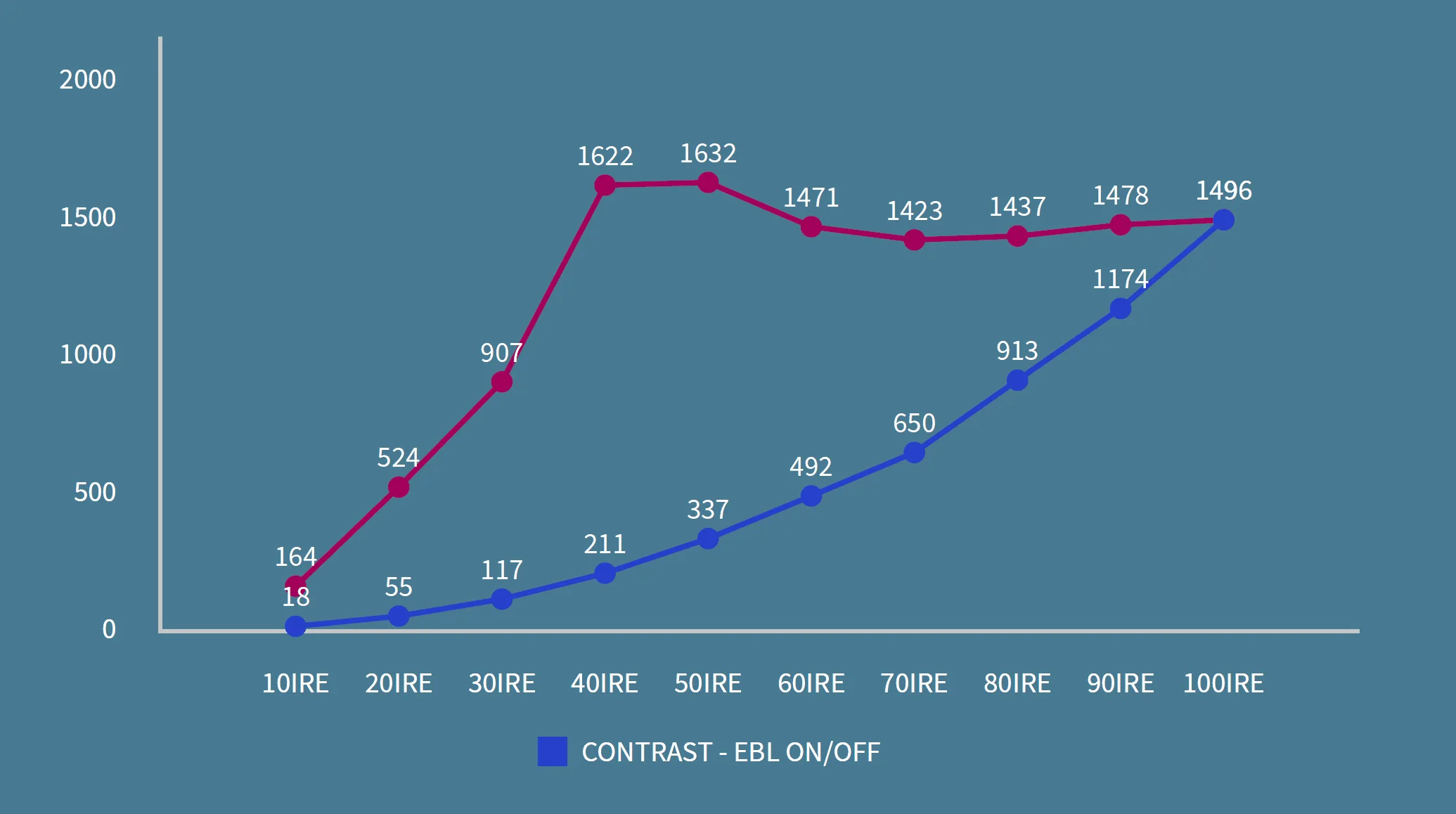 Starting at 10 IRE, the contrast improvement with EBL on is dramatic, nearly tenfold up to 40 IRE, with this significant improvement lasting up to 90 IRE.