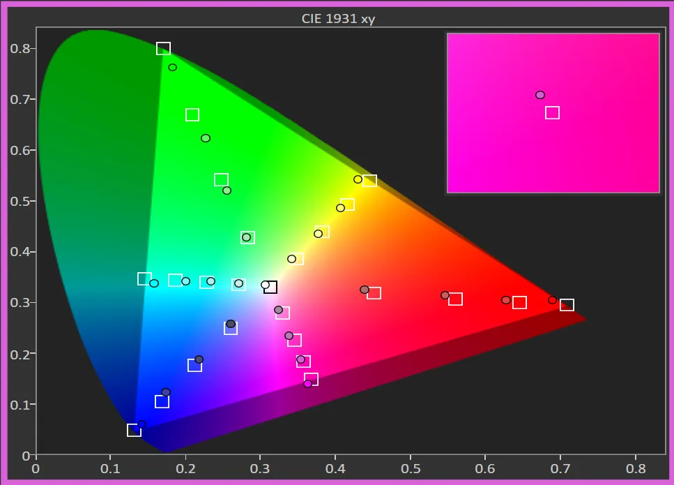 In Theater mode, which is the mode I would recommend using, the measurements are similar but with a slightly cooler average white temperature, as the blue is significantly better balanced compared to the Standard mode.