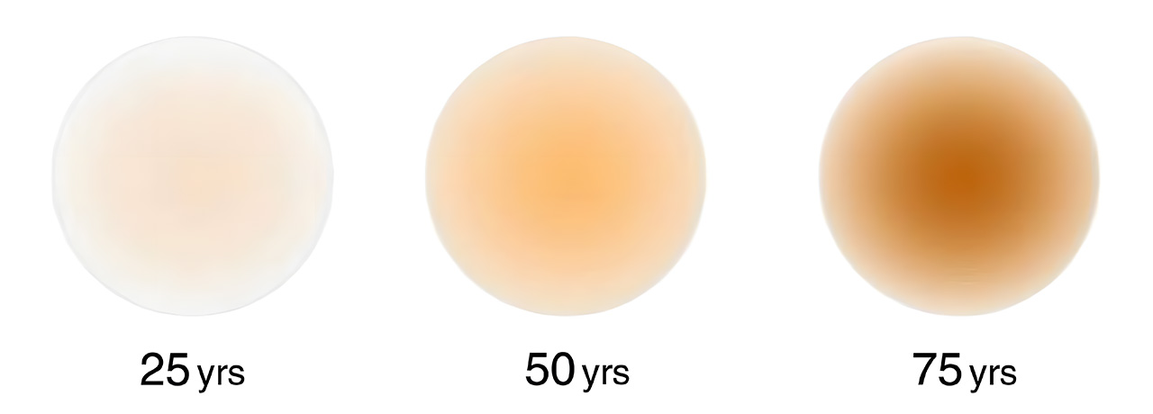 The lens of the eye changes over time, starting clear when we are young and gradually becoming more yellow as we age, which affects how different wavelengths, especially in the blue region, are transmitted to the retina. Under normal lighting conditions, we do not notice this change because the brain slowly adapts and compensates for it.