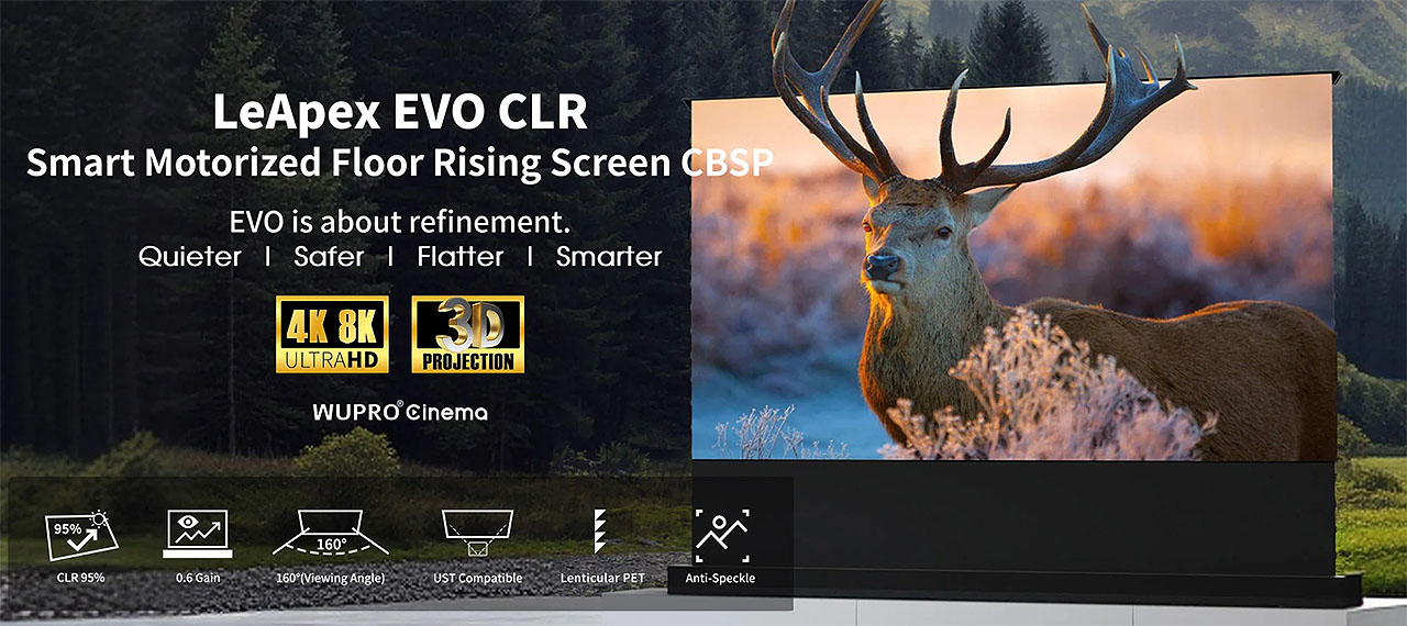 WUPRO has introduced the LeApex EVO Smart CBSP, a new motorized floor rising projection screen designed specifically for ultra short throw projectors. The screen combines a last gen tensioned floor rising mechanism with a high contrast CLR/ALR latest generation CBSP+ fabric, targeting living-room UST setups where ambient light control is always part of the challenge.